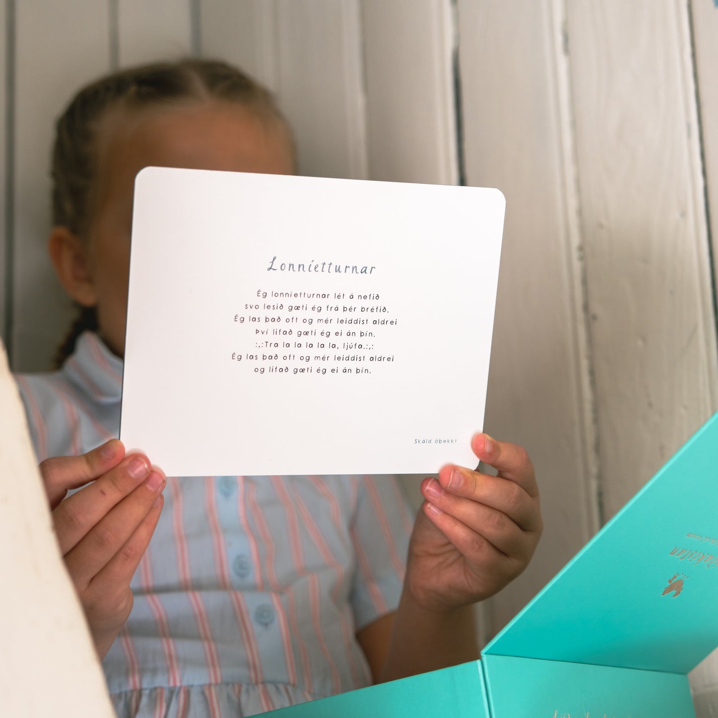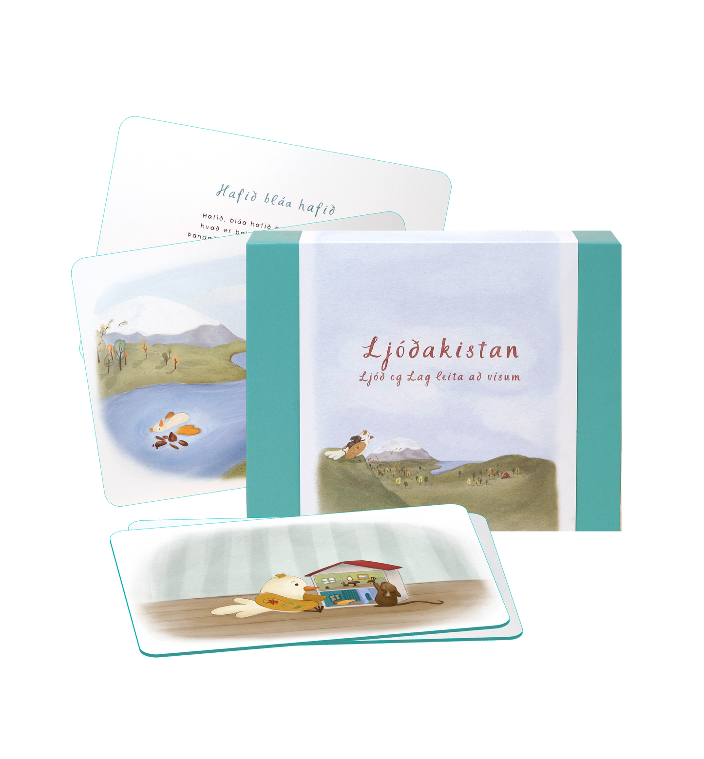 Ljóðakistan er safn 20 fallegra, handteiknaðra spjalda með íslenskum vísum. Á framhliðunum eru hlýlegar myndir af fuglinum Ljóð og hagamúsinni Lag, sem leiða börnin í gegnum efnið á leikandi hátt. Á bakhliðunum eru klassískar íslenskar vísur sem hvetja til söngs, lesturs og samveru milli kynslóða.